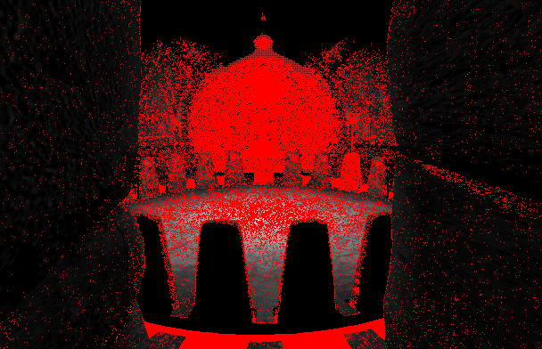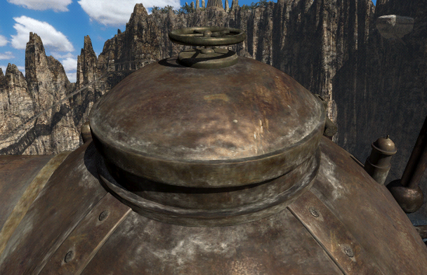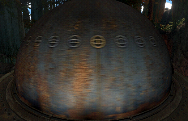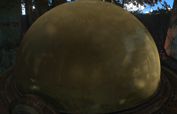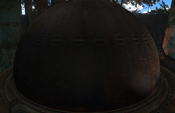 Several anomalies are associated with the state of the spinning dome (this is a recurring theme- every single spinning dome in the game has anomalies.) In cards J121, J124, J133, J154, and J421, the two semicircular "hinges" that sit at the base of the dome are occluded incorrectly, making them fully or partially obstructed by other geometry depending on whether or not the dome is flipped. In J124, you can also see the hinge switch from high to low polygon count.