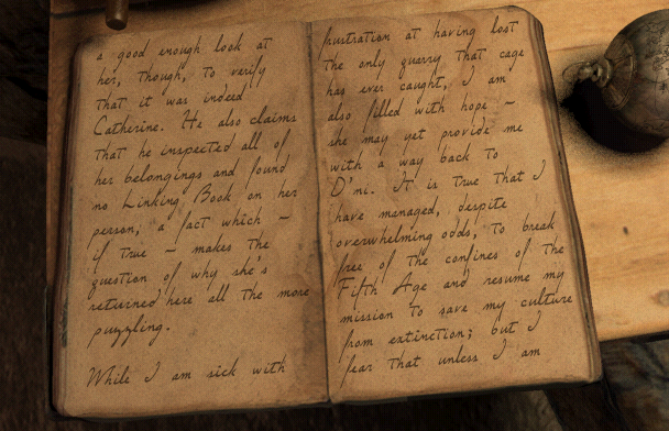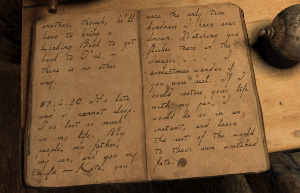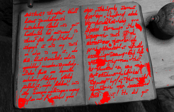 O88, the cell containing Gehn's 233 journal, contains a number of splices. The first diff here shows page 1 compared to page 11, where most of the scene is re-used except with different writing on the paper. The second diff, page 2 vs page 3, is less similar, except the differential highlights show a clear splice on the timepiece. Oddly, flipping through all the pages in the journal shows that there are 2 different reflections on the timepiece, easily visible in the third diff (pages 1 and 2).